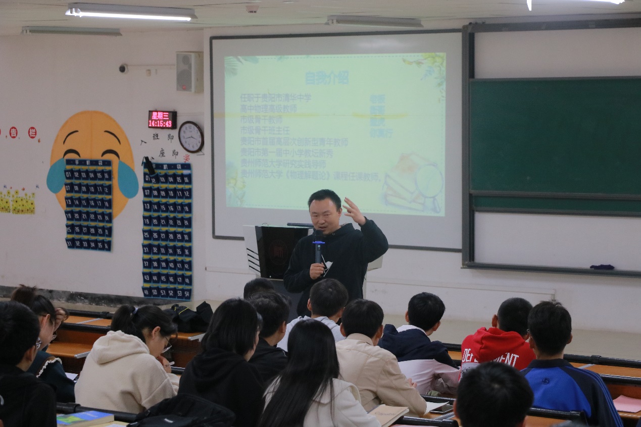 根据教学实践周的安排,为进一步提升物理专业师范类同学们的教学技能水平,提高课堂施教能力。10月28日下午两点,世界杯体育官方网站物理系在花溪校区学院1522阶梯教室开展了名师面对面系列活动第十四期——谈谈课堂教学,19级全体物理学专业同学参与讲座,讲座由贵阳市清华中学高级教师李衠主讲。