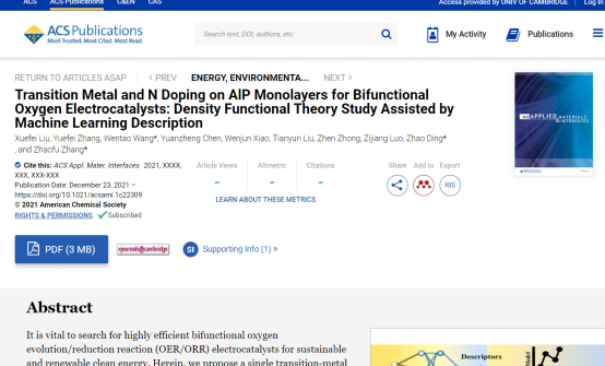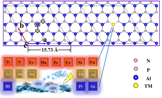 探索一种清洁且可持续发展的新能源以应对日益减少的化石燃料和日益增加的环境污染受到了工业与学术界的广泛关注。电催化还原氧气在金属空气电池等诸多能量转化与储存技术中起着非常重要的作用。然而,主要用于电催化剂的材料大多数为金,铂及其氧化物等贵重金属,其昂贵性与稀缺性使得该类催化剂不能广泛在工业上大规模使用。二维材料具有非常大的比表面积,以及独特的物理化学性质,可为单金属原子提供稳定的吸附位点,可作为理想的催化衬底材料。该工作在含有缺陷的二维AlP中掺杂不同的过渡金属单原子,通过第一性原理高通量计算,筛选出了两种非常理想的单原子掺杂体系,即单原子镍和钴掺杂体系。研究表明,该两种体系具有非常低的OER/ORR过电势,可作为双功能OER/ORR电催化剂。此外,作者基于机器学习方法,找出了影响该体系催化活性的重要描述符,为实验上合成基于AlP体系的单原子催化剂提供了理论指导。该工作得到了国家自然基金项目(Grant No. 12164009)和贵州省科学技术基金(Grant No. [2020]1Y210)的资助。