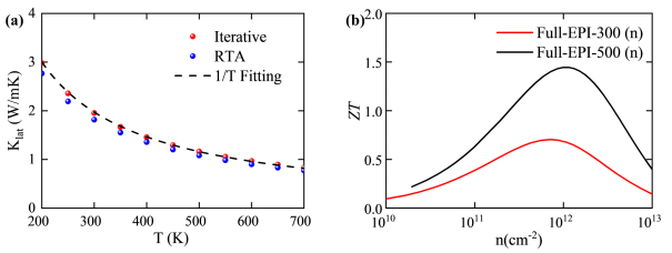 图1.(a)2D NaCuS的晶格热导率;(b)2D NaCuS的热电优值ZT