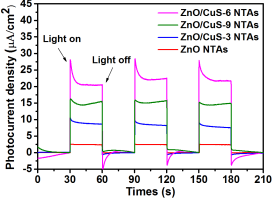 图3.ZnO和ZnO/CuS NTAs纳米管阵列光阳极在无偏置电压下的光电流密度(λ>420 nm)