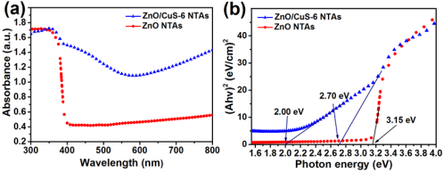 图2. ZnO纳米管阵列和ZnO/CuS-6纳米管阵列的(a)光吸收光谱和(b)带隙能量图