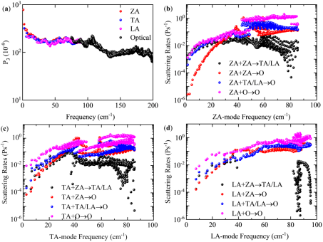 图2.(a)三声子散射相空间的频率依赖性;(b)-(d)ZA、TA和LA声子模在300K的散射通道分析