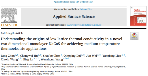 近期,世界杯体育官方网站吕兵教授、中央民族大学王文忠教授(贵州师范大学特聘教授)作为通讯作者指导的硕士研究生周浪在材料科学领域SCI一区Top期刊《Applied Surface Science》在线发表题为“Understanding the origins of low lattice thermal conductivity in a novel two- dimensional monolayer NaCuS for achieving medium-temperature thermoelectric applications”的研究论文。
