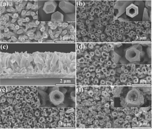 图1.(a)ZnO纳米棒阵列的顶视图; (b)-(c)ZnO纳米管阵列的顶视图和侧视图; (d)-(f) ZnO/CuS-3, ZnO/CuS-6 and ZnO/CuS-9 异质结的顶视图