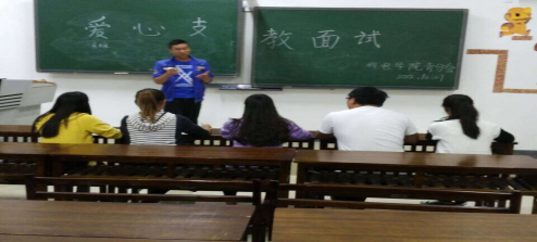 本次面试在物电楼两个地点同时进行,面试共分为自我介绍、课堂试讲、以及面试考官提问三个环节,通过此次面试我们将对前来面试的爱心支教的同学进行筛选,保证学院支教团老师的教学质量,争取为支教点带去更加优秀的老师。俗话说得好;“台上一分钟,台下十年功。”试讲内容多种多样。有诗歌文学、趣味英语、科普小实验等等。同学们在讲台上竭尽全力地发挥着自己的聪明才智,将准备内容讲解地有声有色,精彩无限;面试评委认真地听着同学们的讲解,仔细地观察每一个动作,根据课堂教学效果结合实际支教情况与同学们探讨并根据自己的教学经验为同学提出进一步的改进建议。