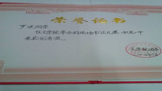 我班罗波同学参加书法比赛所获证书