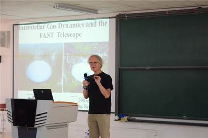 Heiles教授首先从星际气体丰富的观测现象出发,分析这些现象背后有关引力、冲压、湍流和磁场等重要相关物理机制。然后Heiles教授展开介绍了GALFA计划(银河系阿雷西博L波段馈源阵HI线巡天)的主要观测发现(HI线丝状结构与星光极化分布、冷中性介质中HI线丝状结构与法拉第旋光丝状结构成协、HI线在多尺度上的各向异性等)。他认为这些观测结果背后蕴藏着复杂的磁-气体动力学,特别是湍流将超新星爆发能量转移到各个更小的空间尺度的重要过程。他指出理解这些过程需要有多个空间尺度上的多种不同天体对象的详尽观测数据。相比美国阿雷西博300米口径望远镜,中国的FAST望远镜在空间分辨率、天区覆盖面积、接收机数量、电子技术等方面都更有优势,一定能在上述科学问题上发挥关键作用。