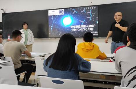 陶炼研究员首先对“全变源追踪猎人星座(CATCH)计划”进行了详尽的介绍。她指出CATCH计划由我国自主研发的数百颗卫星组成,通过对大量变源不间断、无死角追踪监测,实现对引力波、中微子、黑洞天体等前沿科学问题从光学、射电到X射线多波段的联合观测。CATCH前所未有的大视场、高精度、多波段的观测能力,将为国际天文科学发展带来划时代的变革。同时,陶炼研究员针对引力波探测、中微子探测以及黑洞并合等最前沿的科学问题与“南仁东班”学生进行了深入的交流。她指出,目前我国天文学科快速发展,急需大量的天文学专业人才,希望同学们能以南仁东先生为榜样,树立崇高的理想和远大的人生目标,紧盯天文学最前沿科学,好好学习天文专业基础知识,厚积薄发、努力进取,为继承南仁东先生的遗志,投身于我国天文事业奠定坚实的基础。