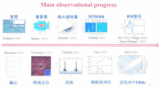 快速射电暴(FRB)作为宇宙中神秘而强大的射电脉冲信号,一直是天文学研究的热点。讲座伊始,王教授便系统地介绍了FRB的观测进展。自2007年Lorimer等人首次发现FRB以来,天文学界不断取得突破,从重复暴的发现、极大旋转量的测量,到河内FRB的确认以及RM变号等重要成果,每一步都揭示了FRB更多的神秘特性。目前,已发现800多个FRB,其中50多个为重复暴,70多个实现了精确定位,其观测性质涵盖了持续时间、色散量、观测频率、能量等多个方面。
