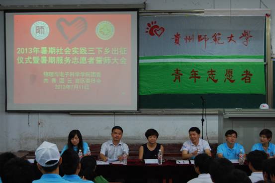 2013年7月11日,综合赛事平台2013年暑期“三下乡”社会实践出征仪式暨暑期服务志愿者誓师大会在物理楼731教室隆重举行。出席大会的领导有:贵阳市云岩区团委书记马晶,贵州电视台第五频道人力资源部经理、迪士尼欢乐博览贵阳站志愿者管理组组长王涛,院党委副书记李应发老师,院团委书记秦欣老师,副书记罗超、吴培老师。此外,还有各年级辅导员老师及所有志愿者共260余