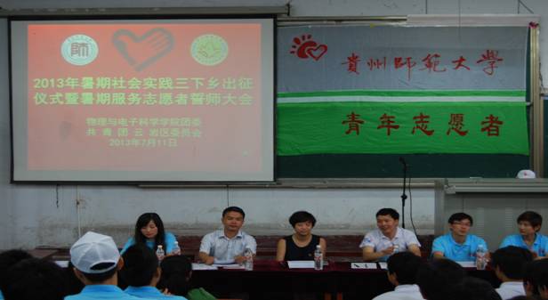 2013年7月11日,综合赛事平台2013年暑期“三下乡”社会实践出征仪式暨暑期服务志愿者誓师大会在物理楼731教室隆重举行。出席大会的领导有:贵阳市云岩区团委书记马晶,贵州电视台第五频道人力资源部经理、迪士尼欢乐博览贵阳站志愿者管理组组长王涛,院党委副书记李应发老师,院团委书记秦欣老师,副书记罗超、吴培老师。此外,还有各年级辅导员老师及所有志愿者共260余人参加了本次大会。