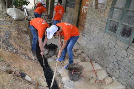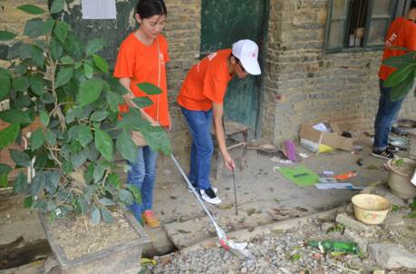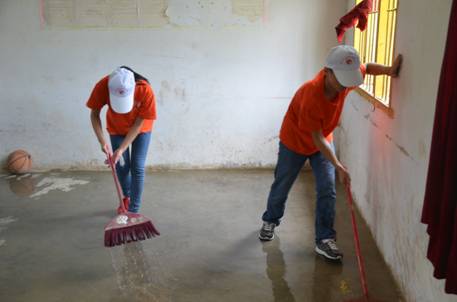 经过近四个小时的车程,志愿者们到达目的地,打罕小学校长和打罕村村支书亲自迎接并为志愿者们准备午餐。午餐后,志愿者们便开始了第一项任务,清扫校园及周边环境,掏水沟、冲厕所、捡垃圾······,志愿者们激情高涨,汗水打湿衣襟、面对脏活累活没有抱怨,而是积极投入其中,为校园的清洁贡献自己的一份力量。打扫过程中,带队老师吴培也积极参与,和志愿者们一起劳作在烈日下。经过三个小时的劳作,杂乱的教室在志愿者们的整理下变得干净整齐,充满臭味的水沟也被志愿者们掏去垃圾,厕所也被打扫的干干净净。