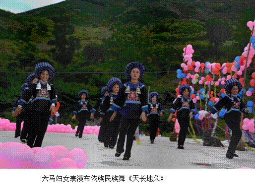 演出在激情澎湃的街舞中拉开帷幕,志愿者与打罕小学的的孩子们用舞蹈动作诠释激情似火的青春。布依族民族舞蹈《天长地久》和一曲《布依族山歌》传达出六马人民对远方客人的热情欢迎。其中,由六马镇的妇女们表演的《广场舞》精美的服饰、动听的音乐把演出推向高潮。由志愿者和小朋友共同表演的朗诵《三下乡,情定六马》,表达出了志愿者们对地方政府和群众的支持的感激之情,同时也表达出了小朋友们对志愿者的依依不舍之情。相声《珍惜时间》告诉小朋友们光阴似箭,要珍惜时间,努力学习。健美操舞蹈《小苹果》传递流行与古典的融合。随着T台秀的表演,志愿者们合唱校歌《挺拔的香樟》将晚会拉下帷幕。