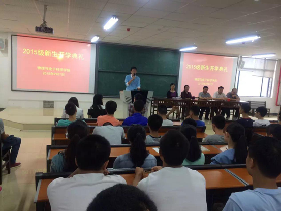 院长陈世国对新生表示祝贺,欢迎新同学加入物电学院大家庭。他围绕学院历史、学科建设、科学研究、社会服务、学团工作等五个方面对学院的基本情况进行了详细介绍,陈院长期望每位同学做好人生规划,掌握学习方法,鼓励同学们要有高远的志向、学习的热忱、坚忍不拔的毅力。教师代表贺启亮博士希望同学们制定切实可行的短期、中期和长期目标,并为之奋斗。新生代表霍鑫一同学表达了对加入物电学院大家庭的喜悦和对大学生活的憧憬,将以饱满的热情迎接全新的大学生活。