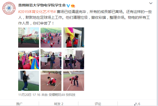 一次运动会就是一场竞争与合作意识的演练,本次体育文化艺术节在本次文化艺术节中,物电学院积极组织宣传、动员广大师生参与其中,取得可喜成绩,不仅让物电学子在运动中学会了互帮互助,体验到了团结协作,也让物电学子在运动中学会了奋力拼搏。同时这也是学校相关部门的大力支持及全院师生的共同努力的结果。希望物电学院师生能够再接再厉,为校园文化建设贡献自己的一份力量。