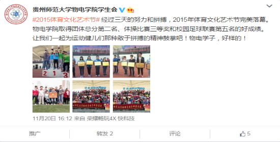 世界杯体育官方网站在花溪校区顺利闭幕的“贵州师范大学2015体育文化艺术节”中喜获佳绩。体育艺术节共历时三天,比赛分为多个项目,经过激烈角逐物电学院团体以荣获团体总分第二名,广播体操比赛获得三等奖,校园足球比赛荣获第五名。