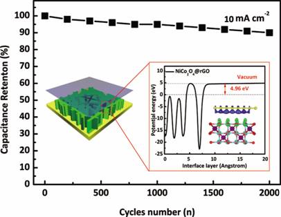 为了验证这种由于功函数差异引起的自由电子的“聚集”效应,我们设计了基于这种纳米复合结构的超级电容器电极。由于其合理的结构特征和优异的导电性能,NiCo2O4@rGO电极表现出超高的比电容(电流密度为5 mA cm-2时比电容高达3.6 F cm-2),优异的循环稳定性(2000次循环稳定性测试,能保持其90%的电容量)。我们研究小组提出的这种通过利用肖特基势场实现纳米复合结构的特定功能的实验方法为高性能功能材料提出了一种新的设计思路。