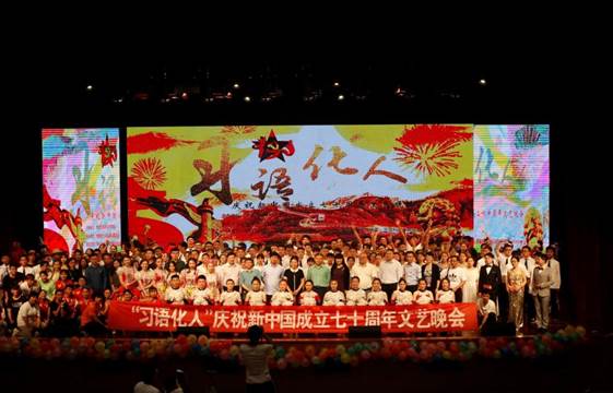 为隆重庆祝新中国成立七十周年,讴歌我们伟大祖国所取得的辉煌成就,积极引导广大师生员工共抒爱国情怀、共话祖国新貌,增强爱国情感、弘扬民族精神,2019年6月11日晚,综合赛事平台党委举办的“习语化人”庆祝新中国成立七十周年文艺晚会在学校大礼堂隆重举行。学校党委书记韩卉、副校长乙引、校长助理梁楠出席晚会,学校组织部、学工部、校团委、资助管理中心、兄弟学院领导嘉宾,以及综合赛事平台全体师生观看晚会。