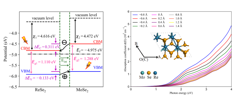 该项工作,通过第一性原理计算软件VASP,首次系统地研究了垂直应力对二维ReSe2/MoSe2 垂直型异质结的光电性质的影响。研究表明,异质结的带隙值能够较好的被垂直应力调控,且II型的带排列性质能够稳定存在,这有利于电子何空穴的有效分离。在研究带排列的过程中,作者独辟蹊径,通过绝对电负性来分析异质结形成前后的带阶,结果与VASP直接计算的投影能带图的结果相差不大,即表明可以用绝对电负性来计算材料的带阶。且在计算过程中考虑周到,不仅考虑了范德华力,而且还考虑了自旋轨道耦合对异质结性质的影响。在带隙计算时还用了HSE06杂化泛函的方法进行了验证。光学性质的研究结果表明,这种异质结具有制备紫外线探测设备的应用前景。