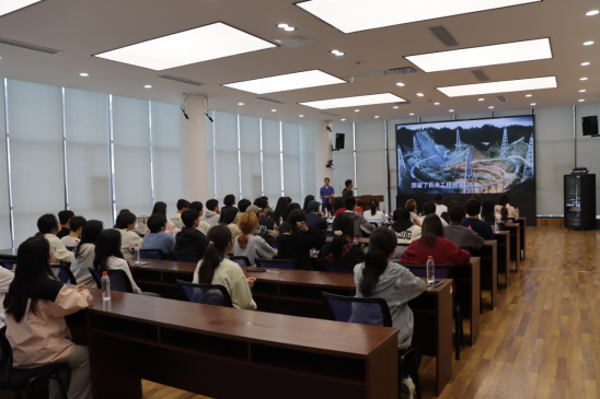 随后,师生们乘车前往FAST实景地。漫步观景长廊,巨大的反射面如银色巨幕铺展于群山之间,震撼景象尽显大国重器的磅礴气势。通过观看专题影片,让大家深刻领悟“天眼”背后的科技伟力与精神内核。