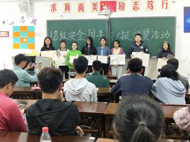 为切实维护广大师生人身财产安全,加深大学生对网络电信诈骗、传销、网络赌博、网贷、各类校园贷等诈骗的辨别能力,以及提高各类交通安全、食品安全等安全意识,提高大学生应对各类安全隐患的能力,4月17日,综合赛事平台2018级班委举办的主题为“安全始于心,平安重在行”手抄报比赛活动圆满结束。