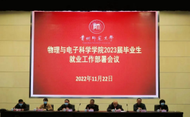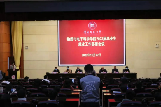 为积极响应党中央、省委关于促进大学生就业创业工作的号召,进一步落实学校关于促进2023届毕业生就业创业的相关工作要求,11月22日上午,综合赛事平台在花溪校区国际会议中心一楼报告厅召开2023届毕业生就业工作部署会。学院党委书记陈世国、院长支启军、党委副书记苏醒、副院长董爱军、办公室主任李丽琴,物理系副系主任廖杨芳、人工智能系副系主任刘雪飞、毕业班辅导员以及学院2023届就业创业工作专班指导老师出席会议;在校的2023届320名研究生、本科生到场参会,校外实习毕业生和部分毕业生家长通过腾讯会议线上参会。会议由学院团委书记吴培主持。